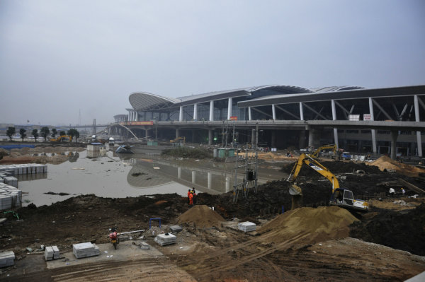 候车厅大楼前广场的施工场景