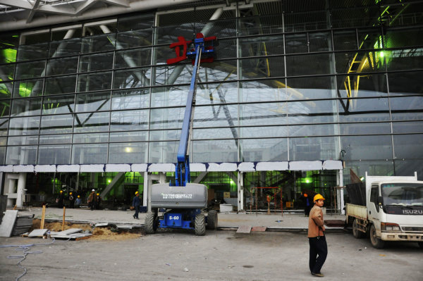 工人正在安装候车厅大楼上的字体