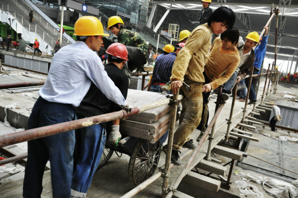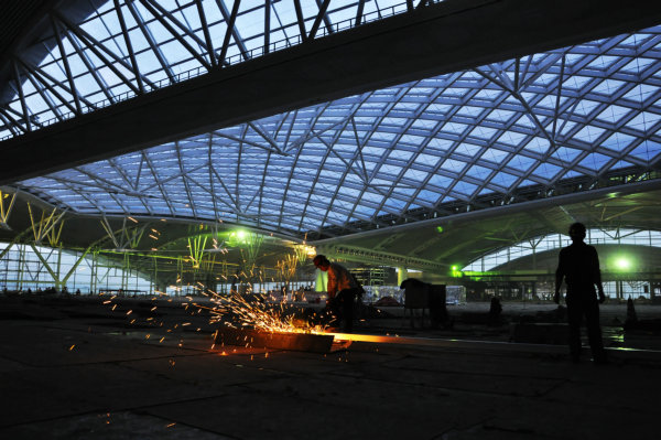 在候车大厅中施工的工人