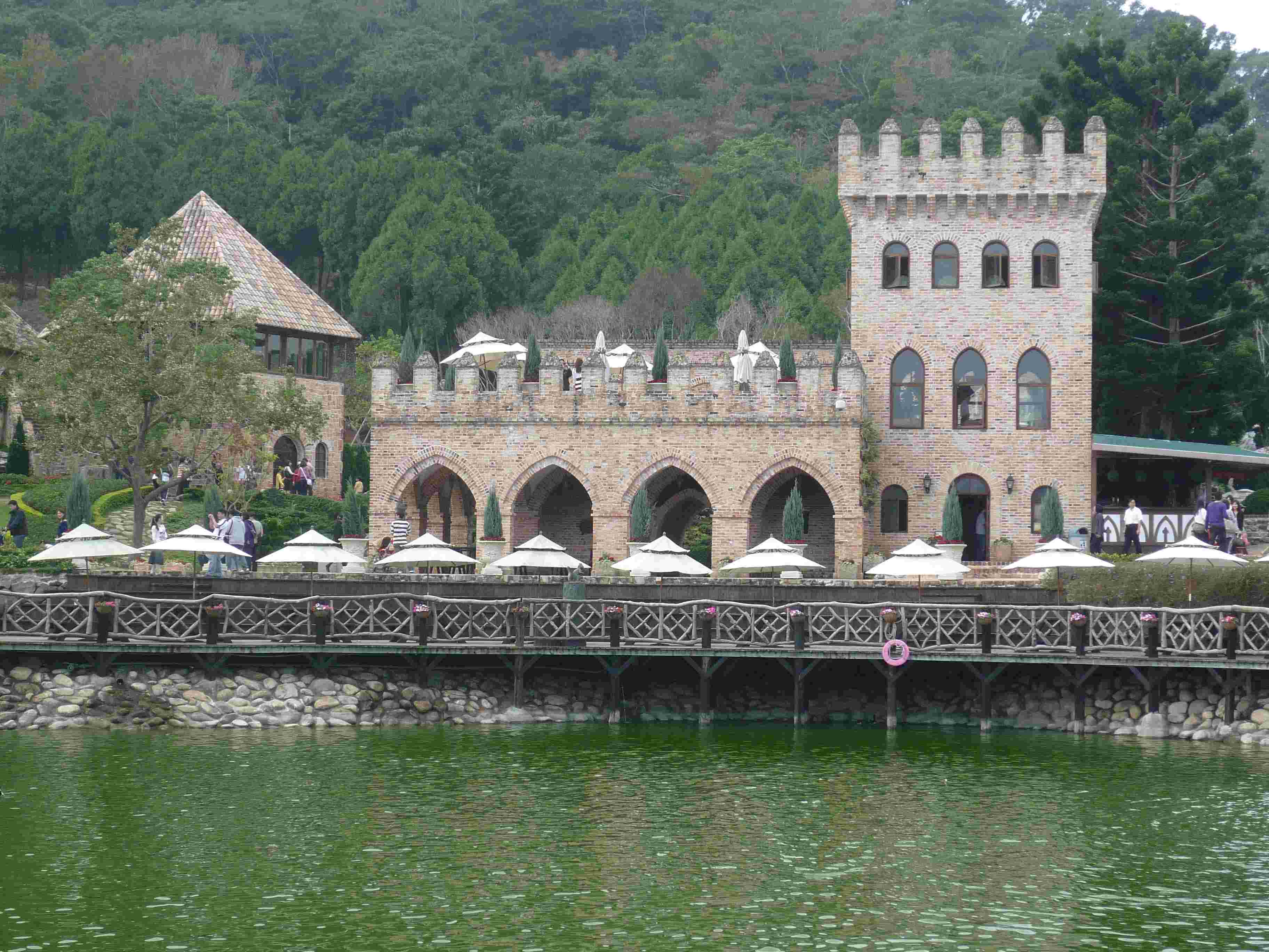 置身浪漫欧洲,古堡花园中;徜徉自然森林,青山绿水间。台中新社庄园可谓是藏在深山的幽兰,由于远离尘世,便多了几分特别的韵味。新社庄园并不像一般的水泥建筑突兀地立在山中,而是以浑然天成的姿态,与山水融为一体。当初设计的理念就是要给人以全方位的美感,事实上它也做到了360°的美丽。漫步庄园,仿佛回到了中古世纪的欧洲,,一个又一个的视觉冲击让人目不暇接。庄园依山而建,中间有一个巨大的湖泊,古堡、花园、酒庄都围绕在湖泊周围,两岸有小桥连接,还有迷雾喷泉居于一角。远处,有登山步道,枫树林和树屋。从瞭望塔上俯瞰全庄,这次第,怎一个美字了得啊!