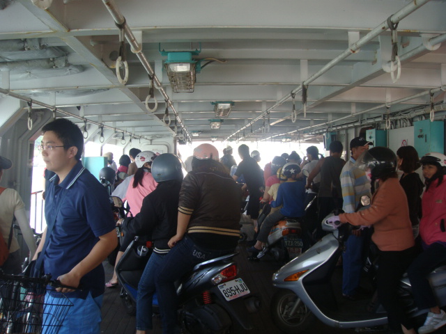 我们骑着自行车,漫步在旗津和西子湾之间,有时看看四周为的海景,有时逛逛周围的景点,那愉快之情跃然纸上。其中,最让我印象深刻的是,我们骑着自行车上渡轮的那一幕。因为旗津河西子湾是在高雄港的两边,要过去得坐渡轮。虽然我是汕头人,在汕头市区也有渡轮,但说真的,我从没坐过渡轮,更没看过行人、自行车、摩托车同乘渡轮的情景,那画面非常震撼。