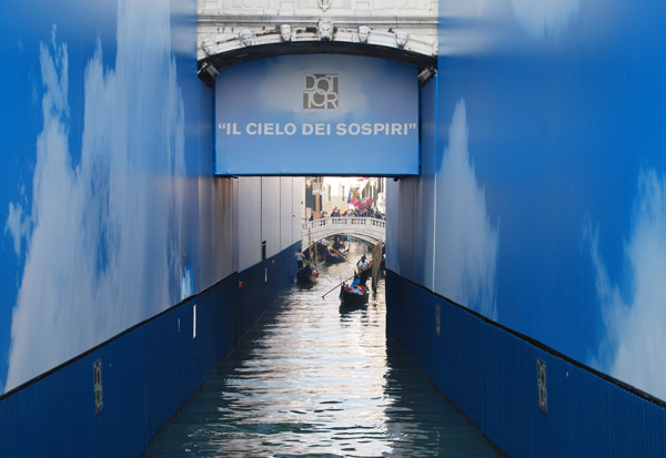 在这个蓝色广告后面的水巷中有着传说中的叹息桥。叹息桥建于1603年,桥两端连结着总督府和威尼斯监狱。