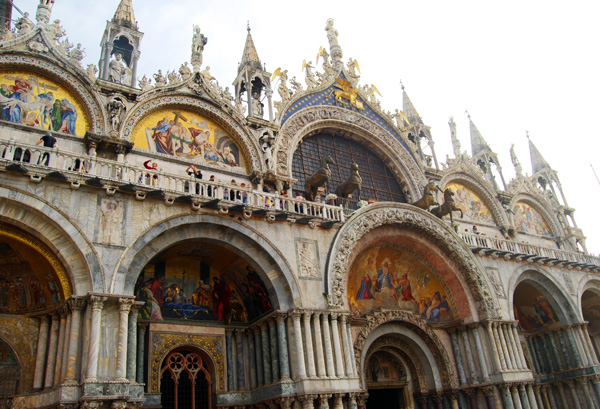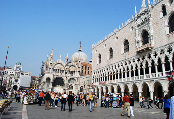 圣马克广场,威尼斯市中心,最热闹繁华的地方,被拿破仑称为“欧洲最美丽的客厅”。广场上的圣马克大教堂,建于公元九世纪,为纪念圣徒圣马克而建,融合了拜占庭,哥特,伊斯兰、文艺复兴等各种建筑风格。教堂装饰极尽奢华之能势,陈列了许多威尼斯的十字军从君士坦丁堡掠夺来到战利品。