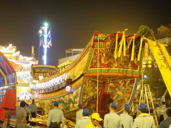 我们下午5点多到的东港。到了那边,我们就随老师到庙口,等着观赏绕境艺阵,当时,跟在王船后面的信徒非常多,个个手里都拿着一炷香,而且,每家每户都在门口摆满了祭拜的东西。晚上7点多时,我们就在东隆宫旁停放王船的地方看“添载”,也就是把王船所需用品搬入船舱,添载物品琳琅满目,如航运器材、生活用品、食物蔬果、文具赌具、马轿生畜、服饰旗帜、仪杖乐器等,应有尽有。十点多时,我们就去看“和瘟押煞”,就是把瘟神等送到船上。
