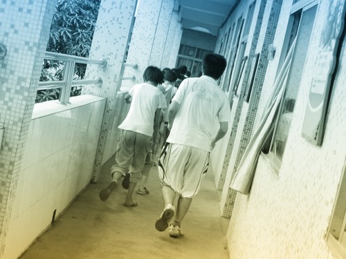 防灾演练中,奔跑着的背影,