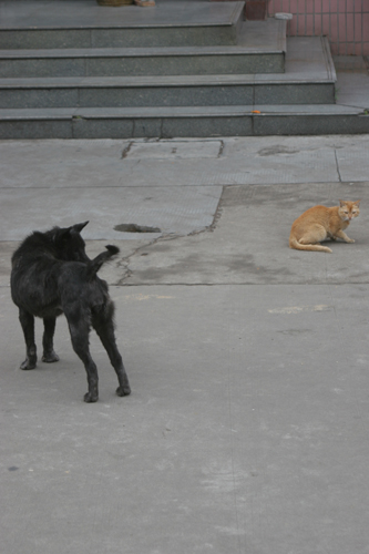 猫靠近着饭堂门口,犬稍微有点远离。猫转,犬也转;犬转,猫也转。不知它们已在这周旋了多久。