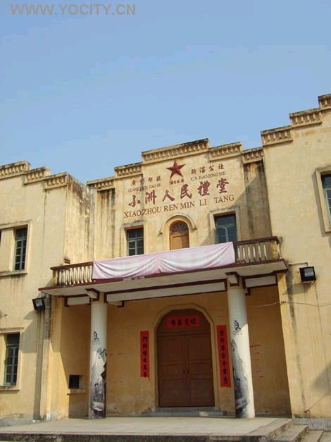走进了这座不经雕刻的民俗博物馆。小洲村河道环绕,巷巷相连,古木郁郁葱葱,河中停泊着木船,河水经年累月拍打着古码头。岭南水乡之气息,轻轻地与江面上的雾气起舞。寻寻觅觅,见到了传说中的小洲人民礼堂。浅黄色的皮肤,写下的是历史与沧桑。墙面上的字体略显隽永,虽算不上飘逸,但也有几分神韵。小洲人民礼堂始建于1959年,至今已有50多年的历史。大门紧闭,但是我们仍能想象到当时农民生产队在这里议论村里的大事的情景。旁边的嫁女饼,算是带着广东地区婚姻文化的地方味。民风醇厚的人们,在女儿出嫁时都会不厌其烦地往来亲友家派饼。他们恪守着这一传统,并身体力行地把嫁女饼派送给亲朋好友。尝了一小块,味道跟普通的饼没有太大区别,但或是因为在小洲村里吃着,别有一番滋味。