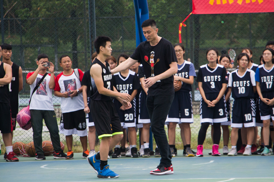 论坛活动结束后,杜锋一行移步篮球场,为我校“走下网络、走出宿舍、走向操场”活动进行揭幕,观看校篮球队训练并进行针对性指导。他除了为队员传授战术,还进行动作示范。本次活动由共青团广东外语外贸大学委员会、学生会及体育部联合举办。