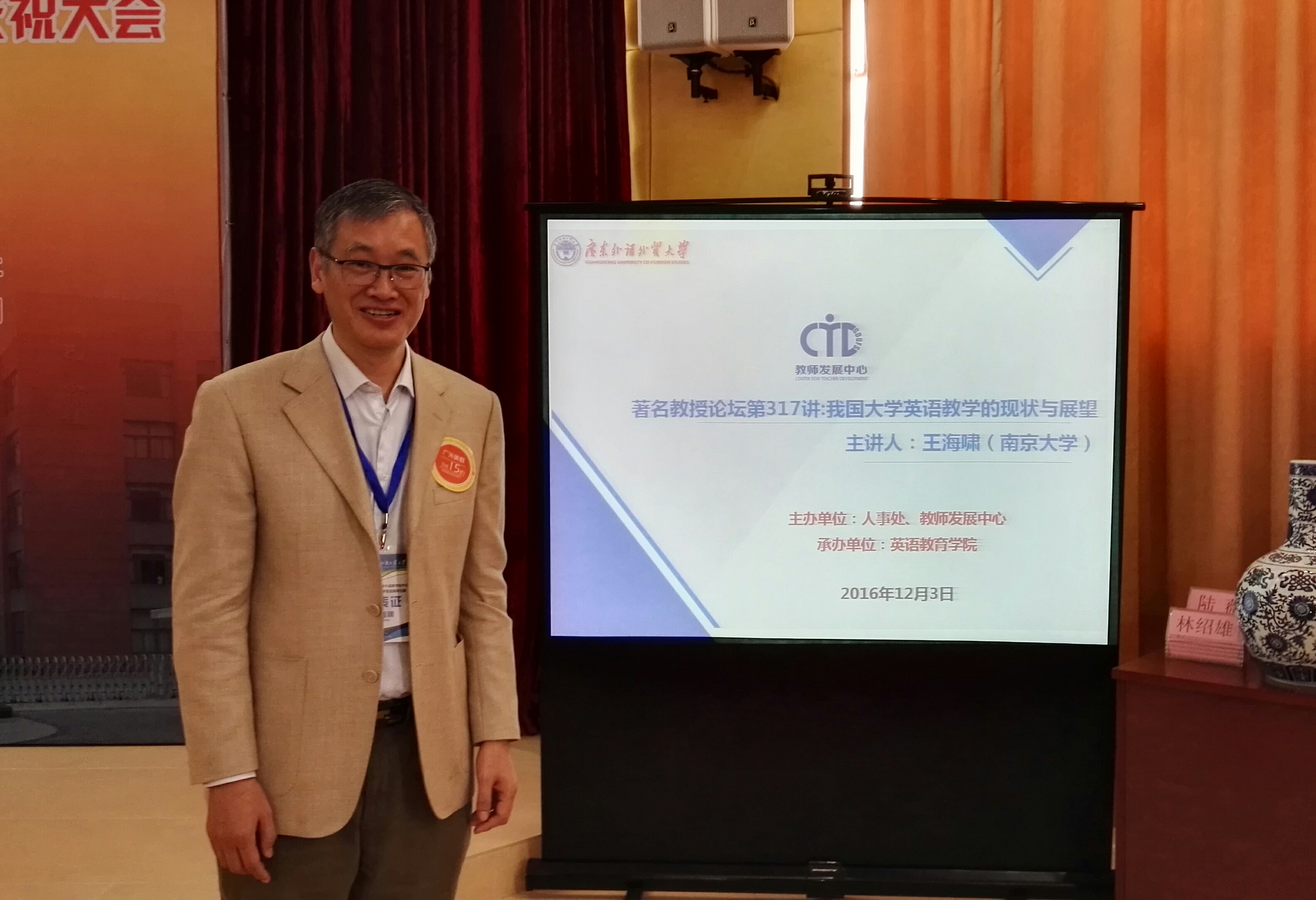 王海啸强调课程体系的“分与合”。即技能的分与合、语言水平的分与合,以及学科院系的分与合。王海啸还就大学英语教师专业发展问题提出看法,他建议老师们可以在词汇、语用、对外传播、国别方面做文章,也可以围绕课程建设进行研究,例如比较借鉴和需求分析,还可以围绕教师发展专题进行研究,例如教师发展专业发展、组织发展和个人发展等。王海啸强调了大学英语教师发展过程中自下而上的努力的重要性。