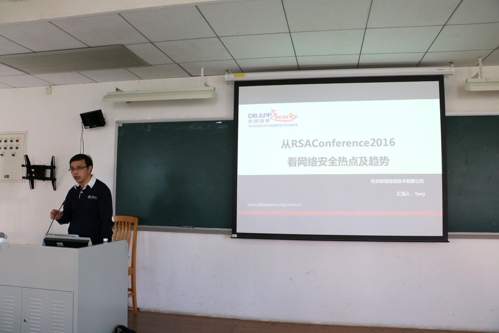 此次讲座是我校第十一届研究生学术文化节活动之一,围绕RSA Conference 2016大会情况、2016-2017网络安全热点问题、RSA Conference 2016带来的启示等问题展开。刘志乐先介绍并解读 “RSA Conference 2016”,讲解2016-2017网络安全热点问题,涉及隐私和安全、数据监管、可信计算、物联网安全、安全协同、威胁感知、云安全等。他指出,“RSA Conference 2016”主题是“Connect to Protect”, 并介绍2016年七大新型网络攻击趋势,其中有网络攻击范围扩大、Windows Power Shell呈现武器化、软件安全成为攻击者新宠、对物联网漏洞基于现实的攻击增多等;此外今年会议上,中国声音、中国力量为历年最大,共有19家中国厂商在大会亮相。