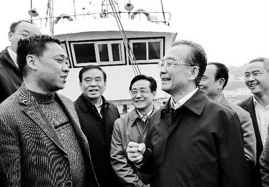 温总理登上渔船,与朱家尖镇樟州村渔民共话海洋渔业发展的美好前景。 本报记者 黄曙林 摄