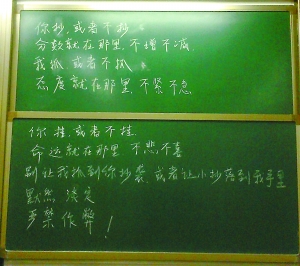 “你抄,或者不抄,分数就在那里,不增不减……你挂,或者不挂,命运就在那里,不悲不喜……”近日,北京科技大学一位监考老师写在期末考场黑板上的警示语被网友热议。这段警示语模仿了最近热映的电影《非诚勿扰2》里的小诗《见或不见》。参加了那场考试的学生告诉记者,刚看到这则警示语时觉得挺好玩的,印象深刻,考完试一琢磨,还挺有道理。