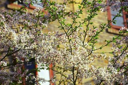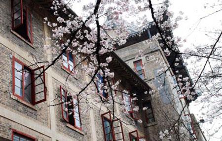 学生宿舍住的多是男生,樱枝就直接地伸到了男生们的窗前。起伏的粉色的花浪翻卷到男生宿舍窗前,俯身望去,花海延绵,心头不知该怎样快活呢。