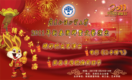 广东外语外贸大学2011年新春团拜暨文艺演出活动定于1月20日下午2时,在北校区云山会堂举行,届时,校领导将到现场给全体教职工及离退休老同志带去新年的祝福。活动安排精彩的文艺节目及电影《让子弹飞》,文艺节目期间还将进行抽奖。欢迎全体教职工参加!