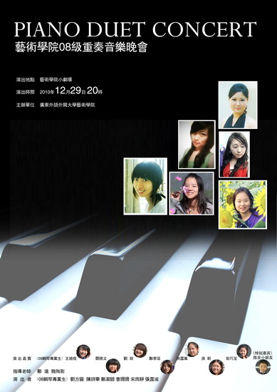 新年的脚步悄然而至,2010年的尾声即将奏响。正值新年来临之际,艺术学院08级钢琴生将为大家献上一场精彩绝伦、不同以往的音乐会—钢琴重奏音乐会。