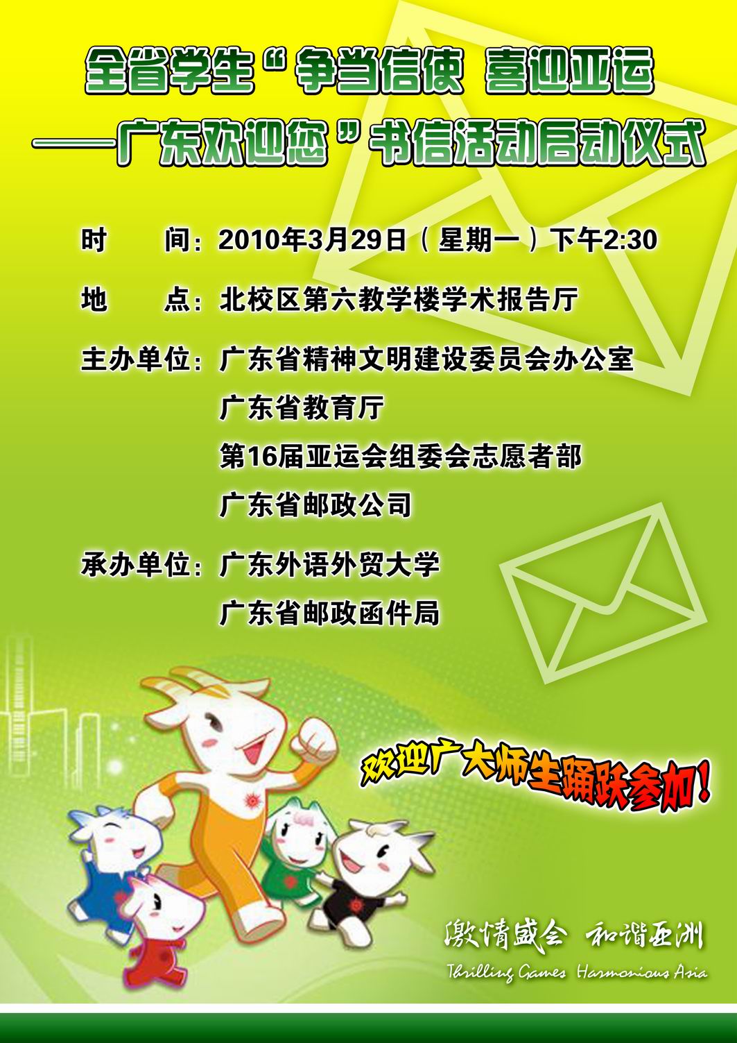 为迎接第16届亚运会召开,广东省精神文明建设办公室、广东省教育厅、第16届亚运会组委会志愿者部、广东省邮政公司将联合在全省各大、中、小学开展“争当信使 喜迎亚运——广东欢迎您”书信活动,鼓励广大青少年争当亚运志愿信使,关注亚运、祝福亚运、参与亚运,通过书信广泛传播亚运信息,传递亚运盛情,在活动中向全世界人民展示广东青少年学生充满阳光、朝气蓬勃的精神风貌,表达广东人民尤其是青少年学生热情好客的文明风范。以期通过活动,掀起新一轮迎亚运热潮,促使“激情盛会、和谐亚洲”深入人心。活动的启动仪式由我校承办,具体如下:
