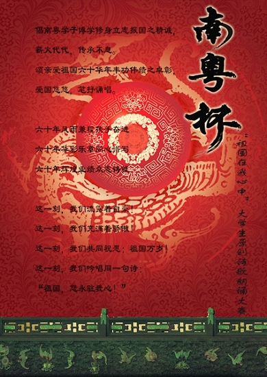 时值中华人民共和国六十周年华诞,为开展“立志、修身、博学、报国”主题系列教育活动,在高校校园唱响共产党好、社会主义好、改革开放好、伟大祖国好的时代主旋律,营造团结奋进、昂扬向上、和谐安定的良好氛围,兹定于2009年11月27日(星期五)晚上19:00在北校云山会堂举行广东省“‘南粤杯’祖国在我心中”大学生原创诗歌朗诵大赛决赛。欢迎同学们到现场观看!