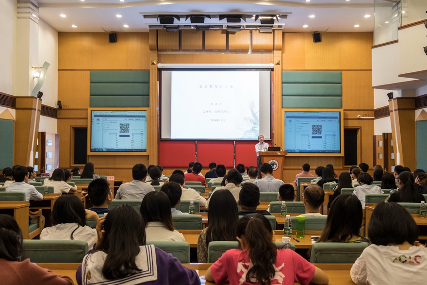本网讯 11月9日下午,时代楷模曲建武在国际会议厅围绕“爱是教育的灵魂”这一主题,从教育的本质、意义、如何做好教育工作以及怎样做好辅导员等四方面,为我校师生上了极其生动而又有意义的一课。精彩报告,赢得了全体与会人员经久不息的掌声。报告会由校党委常委、副校长刘海春主持,学生处处长谢应东,校团委书记苏奕和各学院辅导员、学生参加。