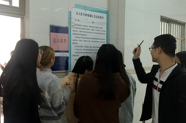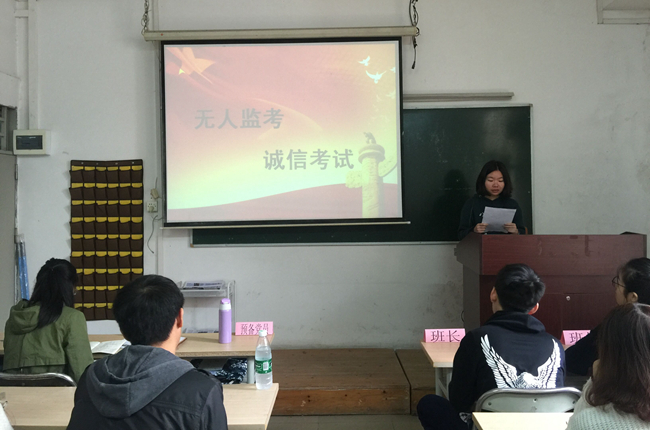 本网讯 诚信考试是社会诚信体系的重要组成部分,对学生进行诚信考试教育是学生思想道德教育的重要内容之一。为培育和践行社会主义核心价值观,继续教育(公开)学院从2017-2018学年度第一学期开始筹备“无人监考•诚信考试”教育活动,通过集体参与、责任连带的方式,使学生之间互相监督、互相制约,以减少、杜绝考试作弊等不诚信行为,以达到以诚信促考风,以考风促学风校风的目标。今年上半年,继续教育学院率先在外语系、工商经济系、艺术设计与信息管理系各甄选一个班级作为“试点班级”(优先选取有学生党员、学生预备党员的班级)进行以“无人监考•诚信考试”为主旨的期末考试。