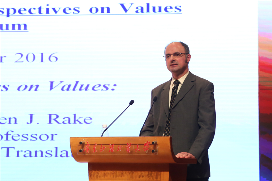 Stephen J. Rake 的主旨演讲围绕中英价值观比较展开。他用图表形式将中国社会主义核心价值观与英国主流价值观进行了对比,他认为,一方面,中英两国价值观在对富强、公正、法治和民主等的追求上具有一致性;另一方面,中英价值观不仅由于存在语言(包括语音语义)的天然障碍,因而给定义和理解两国价值观造成了困难。而且两国价值观的优先排序存在着差异,对价值观的解读也不尽相同,如“中国更侧重集体主义,爱国就意味着团结,忠于国家,而英国更侧重个人主义”。此外,宽容、多元、包容、融合也是英国主流价值观的特色。他强调,正确对待和处理中国的社会主义核心价值观与英国主流价值观的异同,在文化交流中既要保持文化敏感度,也要尊重各自的文化传统,对增进互信、促进中英两国之间双边关系发展,意义重大。
