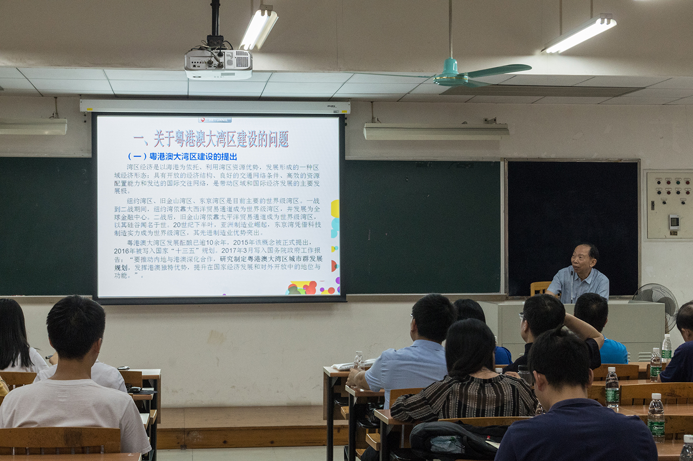 本网讯 5月24日下午,学校首批思想政治教育宣讲团专家、我校原副校长董小麟教授在南校教学楼F209,为新闻学院师生带来“粤港澳大湾区建设与广东新时代发展”专题讲座。