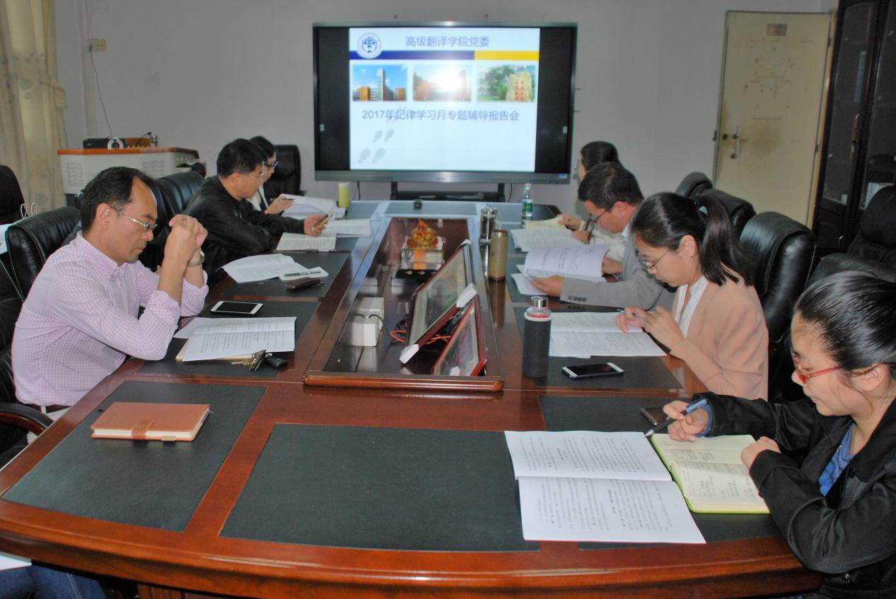 本网讯 10月16日下午,翻译学院党委召开纪律教育专题辅导报告会。翻译学院院长赵军锋出席会议,学院党委书记刘志军作专题辅导报告。报告会还邀请了学校党办、校办和财务处的工作人员围绕合同管理、国内公务接待、差旅费管理和干部约谈等开展专题培训,学院系主任、学院行政管理人员等参加会议。