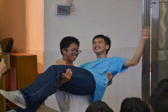 但这样却难不倒这些聪明的学生,有两组实力强大,你一句我一句,不相上下。在持续的对决中将现场的紧张感推向顶峰,观众们都屏住呼吸细听有没有一组出现失误。结果班长所在组出错,报纸被叠后,班长被迫背起了组员,滑稽的样子惹得全场哄堂大笑。