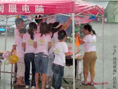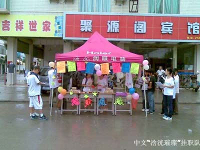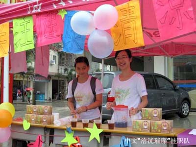 大约一个小时后,雨水开始变小,乌云散去,队员们迅速地重新摆出摊位,正式开始“关注健康,清凉一夏”的服务活动。虽然因为雨天市场的行人减少了,可是队员们没有感到沮丧,反而积极地走向路人,走进市场,热心地为群众宣传夏天卫生小常识和甲型H1N1流感知识,为他们送上一杯徐其修凉茶。很快,人流开始多起来,也有不少人主动前来喝凉茶和了解一些卫生知识,队员们都用十足的热情用心服务,细心端上精心泡做的凉茶,耐心讲解健康卫生常识。