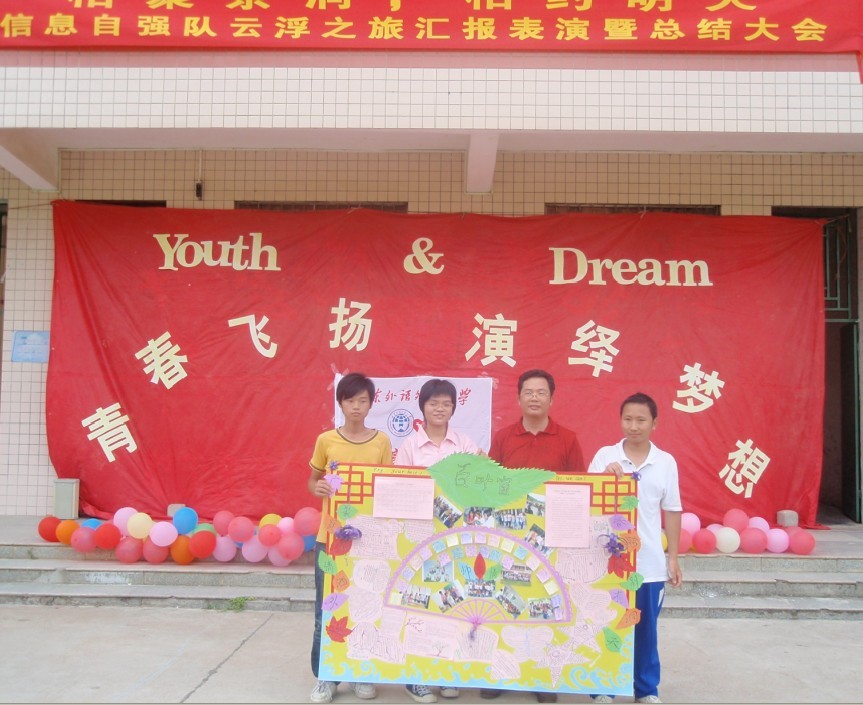 下午三点半,总结大会正式开始。信息自强队队长陈真容代表信息自强队全体队员对整个下乡活动做了总结。在总结中,她简要地总结了各组的工作情况并汇报了队伍在下乡过程中所取得的成果。接着石城镇茶洞中学校长戴少雄、石城镇党委委员温彩芳先后发表了讲话。在讲话中他们都高度评价了信息自强队在此次下乡过程中所取得的成绩并祝愿信息自强队在次日的返校旅途中一帆风顺。最后戴少雄代表校方向信息自强队赠送了“信息自强爱传茶洞,义教活动惠及四方”的锦旗,陈真容也向茶洞中学校方赠送了一幅精心设计的三下乡成果宣传海报。海报中“广聚贤才情洒外土,茶香满园别有洞天”的对联不仅拉近了我校和茶洞中学的距离,也预示着信息自强队和茶洞中学三年的下乡协议能够顺利实施。