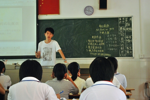 英语组的老师选择了向学生们讲授语法,语文组的三个老师更是步调一致,都带去了富有特色的三分钟即兴演讲,“我的90后”、“我的梦想”、“网络时代”等几个话题令人耳目一新。三班的一位男同学在老师的鼓励下终于走上了讲台,腼腆的他说道:“小时候我的梦想是当NBA球星,现在我的梦想是考上大学……”但与此同时,三个老师的教学方式又各有千秋,一班的老师马冬蕾在讲课之余带领全班读上了绕口令,“八百标兵奔北坡,炮兵并排北边跑,炮兵怕把标兵碰,标兵怕把炮兵炮”,老师的快嘴博得了大家的阵阵掌声,课室里笑声不断,师生形成了良好的互动。