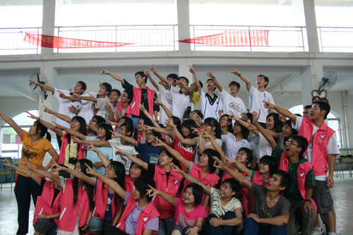 云浮郁南县蔡朝焜纪念中学的三下乡队伍“仲夏梦”一直秉持“一家人”的理念,在向学生传授知识的同时也不忘与学生共同娱乐。清晨,队员们便来到了办公室准备趣味运动会的物资,但此时走廊里已经有很多学生站着说说笑笑讨论即将举行的趣味运动会了。