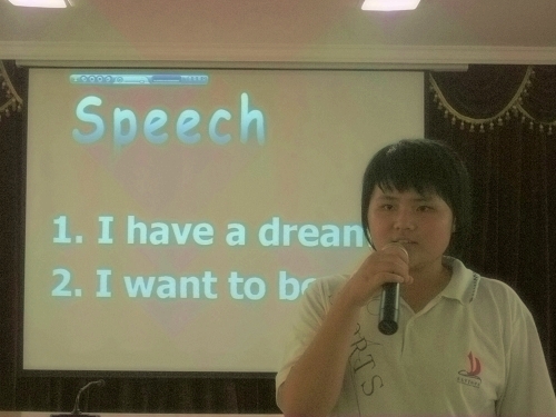 首先进行的是演讲环节,题目为“I have a dream”。选手们镇定自若的临场表现博得阵阵喝彩,他们纯真的梦想也深深打动了评委:有的想当一名老师,传播知识;有的想当医生,悬壶济世;有的突发奇想,想成为一只小鸟,翱翔蓝天……2号选手嘉绮刚上场时非常紧张,没有发挥出正常水平。最后在评委及观众的掌声鼓励下,她才放开自己,渐入佳境。面对评委的刁钻问题“如何当好公务员”,嘉绮用英文流利地表达了自己从现在做起、努力学习的决心。