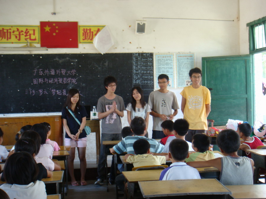 由于部分负责罗定素龙中心小学的小分队暂住在素龙中学,所以他们必须得走十来分钟路程才能到达学校。上午七点,经贸罗六的队员们早早到达小学,马上与小朋友们一起热情地相互自我介绍起来。