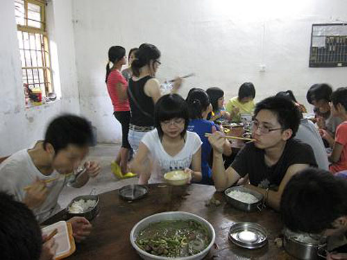 每天最兴奋的时候,就是吃饭时间。队员们齐聚一堂,边吃饭边交流今天的义教工作。简陋的厨房,简单的饭菜,开心的队员。在艰苦的生活中,队员们却不失风趣,个个都自封为厨神、食神,不时引起哄堂大笑。真是辛苦并快乐着!