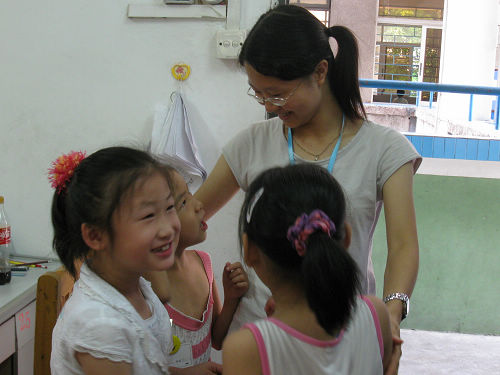经过一天的授课,学生与老师之间已经基本熟悉起来。老师薛仲飞的名字在孩子们口中经历了多重变换,从“飞飞老师”到“飞机老师”,再到“狒狒老师”,学生的调皮让人忍俊不禁。一位学生“真诚地”对老师温婷婷说:“老师,我希望你再长高一点”,孩子们的“经典语录”已经成为队员们最津津乐道的话题。而这些“语出惊人”的孩子们也特别懂事,班主任刘珂嗓子疼痛,一位学生主动端水给她喝,“老师,你嗓子疼,要多喝水。”调皮的孩子也有体贴的一面,让队员感动不已。
