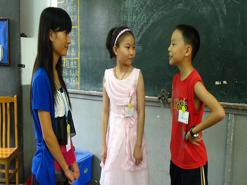 而在三(一)班的教室里,情景对话正在火热进行。在教授了一些基本交际用语后,老师请学生上台表演情景对话。一些学生的临场应变和活学活用令老师们感到十分欣慰,而有些学生“中英相加”的童真童趣也给课堂带来了很多欢乐。