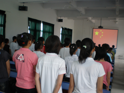 本网讯 7月16日早上8点30分,三坑中学的多媒体教室热闹非凡,广东外语外贸大学“爱心中”志愿者服务队在此举行了三下乡启动仪式暨义教开学典礼。出席活动的有三坑中学校长梁锦钊,校团委副书记熊彬,“爱心中”服务队队员及参加此次三下乡义教的所有同学们。在激昂的国歌声中,升旗仪式拉开了此次典礼的序幕。