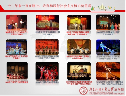 法学院红色经典晚会由学校党委宣传部和法学院主办,始创于2005年,历经十二载,从未间断。作为学院着力打造的思政特色第二课堂,该活动已成为学院思政工作的有效抓手和学生活动的校园文化品牌。活动在每年12月举办,内容结合时政热点,针对既定主题,面向全院各班招募节目,通过演绎红色经典剧目,促使思政工作进班级、进舞台、进灵魂,在学生中传递社会主义核心价值观,展现法学学子爱党、爱国的家国情怀。