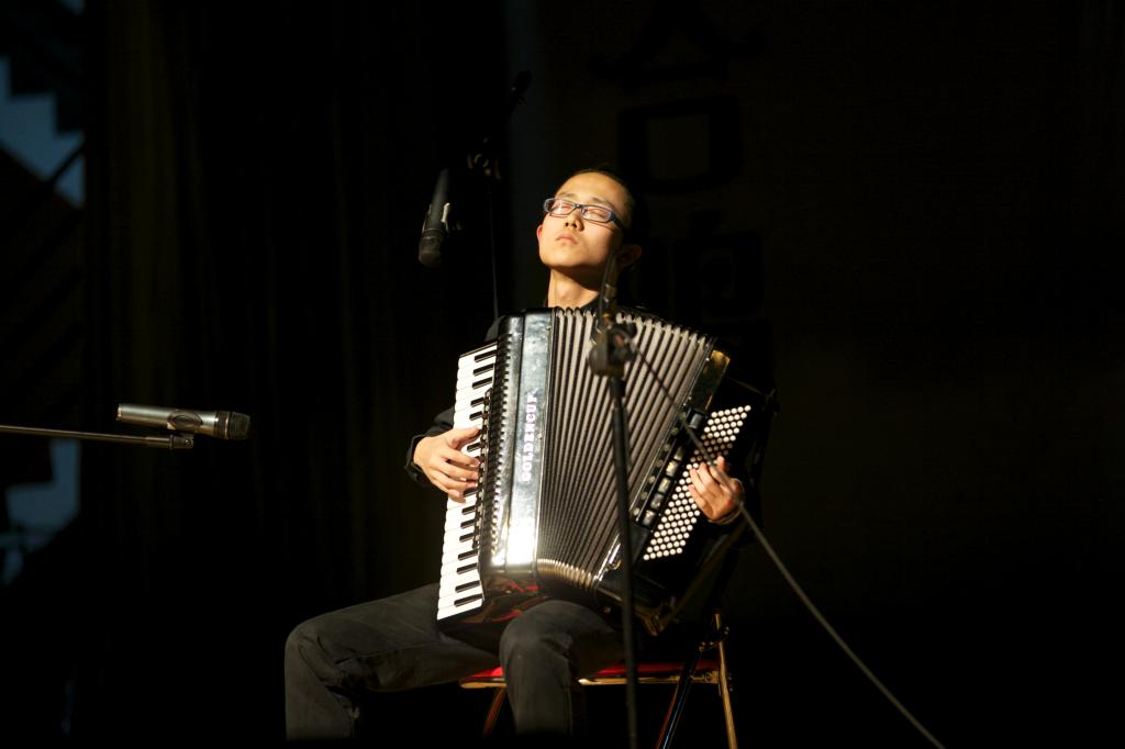 左边是由一个个小圆点组成的低音键钮,右侧分布着直立向外的黑白键,一个叫风箱的发声原动力在中间伸展,这个乐器的名字简单易懂——手风琴,一个用手操作的风琴。不过,结构复杂的外表赋予了它多个使命,不仅能参加重奏、合奏,还能够担当独奏的角色,用以演奏音色变化丰富的多声部乐曲,可以说“一架手风琴就是一个小型乐队”。它的每一寸“肌肤”在弹奏者的触摸下都可以发出意料之外的美妙声音,或用指关节轻敲,或用手指刮过,每一种声音都在节奏的润滑下变得妙不可言。这是一件小众的乐器,但是对于法语专业大四的学生陈润锋来说,却是再也熟悉不过。