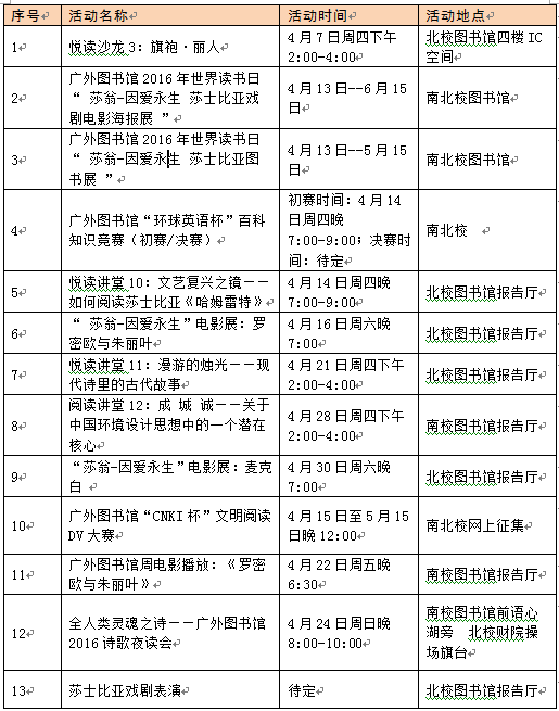“世界读书日”阅读日系列活动更是不容错过。往年不必多说,今年恰逢莎士比亚逝世400周年,世界阅读日的活动有了一丝与众不同。今年4月的活动主要围绕“莎翁”展开,如“莎翁——因爱永生莎士比亚戏剧电影海报展”、“莎士比亚图书展”等等一系列活动,穿插“悦读讲堂”、百科知识竞赛、“CNKI杯”文明阅读大赛和诗歌夜读会等等。其中, “莎翁——因爱永生”的系列活动、知识竞赛、“CNKI杯”和诗歌夜读会在南北校区将都举办,“悦读讲堂”的活动则主要在北校区举行。