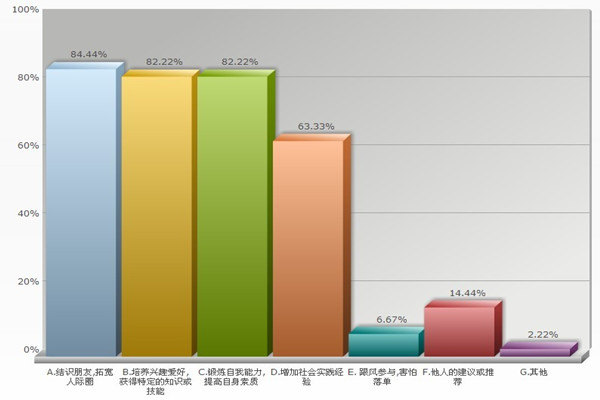 根据问卷调查,记者了解到新生加入社团主要是为了拓宽人际圈、培养兴趣爱好、锻炼能力以及增加社会实践经验,受他人或跟风心理影响的是少数。正如“薪火”讲师陈强所说,“参加社团工作能让大一新生接触更多的人,丰富自己的人脉关系,寻找到志同道合的朋友,锻炼自己沟通能力和处理纠纷的能力,展示自己的才华和能力”。