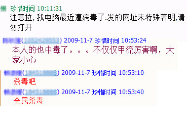 中文学院的陈同学说她的QQ也中过病毒。据介绍,她中的是爱情测试类的病毒,病毒是将她的QQ签名和空间日志更改。“当时我的签名被改成有关爱情测试类的,日志也莫名其妙地增加了几篇,都是关于爱情测试类的。”小陈说,“起初我都不知道,还是我同学看到我的签名问我时我才知道的。”对于被无故添加的空间日志,小陈说,她是采用删除的方法,但是每隔几天就又会自动添加上,直到她后来重装系统后才解决。对此小陈也显得很无奈。