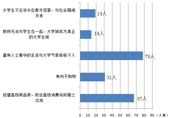 大部分学生认为,现在楼价居高不下,能买得起房的大多是有钱人,过于浓厚的商业气息会对校园学习文化、人文气息产生不良的影响。来自华工的胡同学也表示,最不希望在大学城出现酒吧街、夜总会等商品房的“衍生物”。