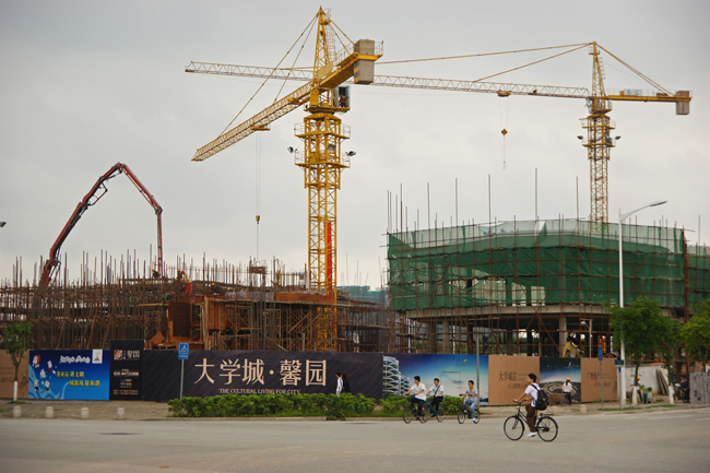 学生们骑车经过正在基建的商品房