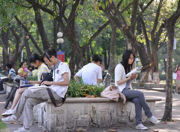 在南校区就读了两年后搬到了北校区、商英学院的小吴说:“语言的学习大都靠自觉。学语言的孩子很多都是很刻苦的,晨读当然也是必不可少的学习过程。不仅晨读,北校的晚读也是很有名的。很多人夜自修完了以后还要去二教晚读,晚上十点多了,二教还是书声朗朗的,久而久之,任何一个人都会受到这种气氛感染的。我就发现我们班的同学自从搬到北校之后变得勤奋多了。”
