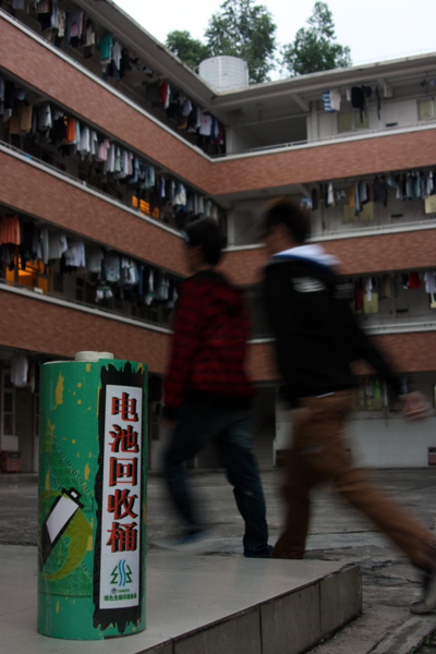每个宿舍楼下都放置有电池回收桶