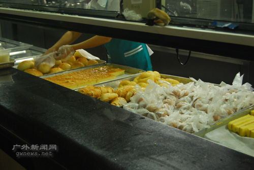 工作人员用塑料袋装面包(图/记者 郑冬璇)