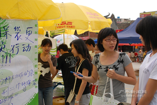我校环保协会会长吴金貂介绍说,在广外环保日中,协会就塑料袋收费之类的环保问题进行了一系列调查活动,并于后期面向全体同学展示成果,以达到提高学生环保意识的目的。同时,协会还通过拉赞助等多种方式,引入一批绿色环保袋,并在各种活动中派发给同学。