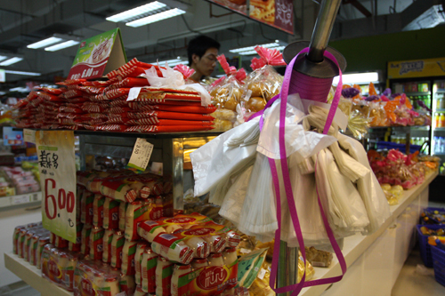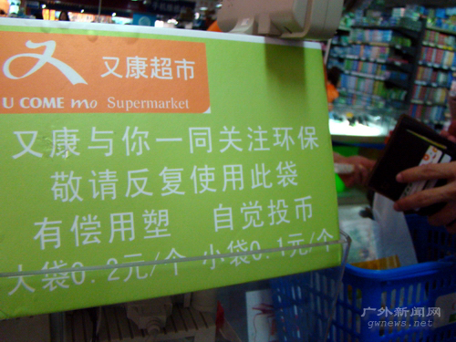 随着6月1日的临近,很多超市都开始出售环保型购物袋。在我校“又康超市”的收银台前有提示牌写道:“又康与你一同关注环保。敬请反复使用此袋,有偿用塑,自觉投币。大袋0.2元/个,小袋0.1元/个”。各色的环保袋也早已陈列出售。
