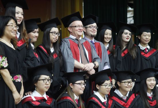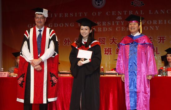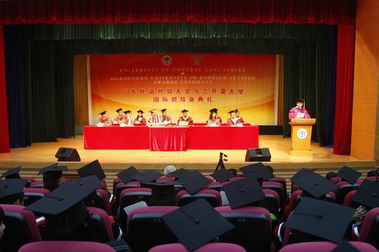 本网讯 6月25日下午,我校与英国中央兰开夏大学(以下简称兰开夏大学)国际班结业典礼在北校六教报告厅隆重举行。在广外校歌悠扬激昂的旋律中,兰开夏大学执行副校长格拉汉姆·伯德温、我校副校长方凡泉及两校领导、教师代表,在国际班125名学子及家长们雷鸣般的掌声中缓缓步入会场,开启了结业典礼序幕。